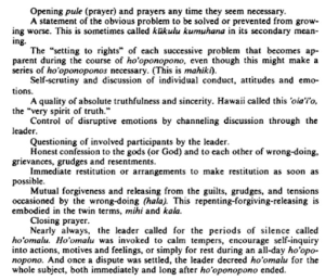 Ho’oponopono is not a standard step-by-step methodology to apply to any grievance without context. It requires an elder skilled in the practice to facilitate. Usually, it consists of some combination of the following: